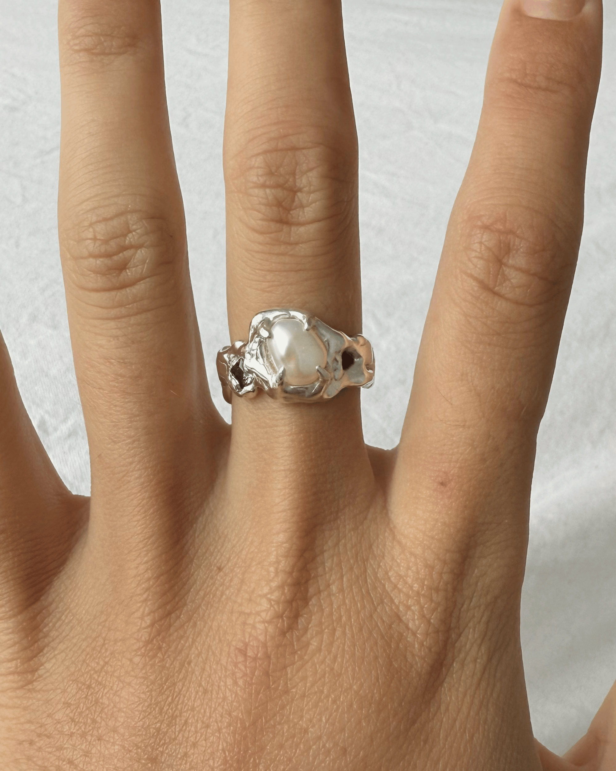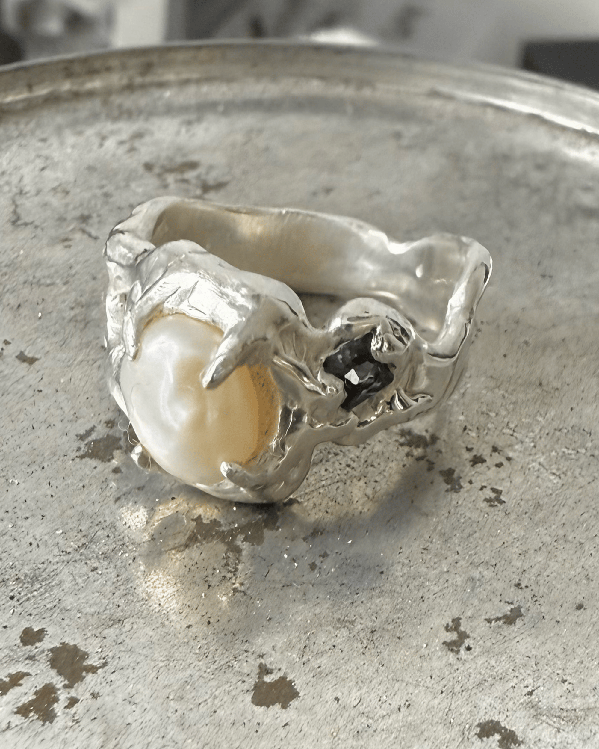Ring 02 of the 'GROTESQUE' mini-drop—grotesque but delicate, the ring has a timeless and classical flare, designed as a contemporary heirloom. An asymmetrical and organic design, the ring has a mix of gemstones.
