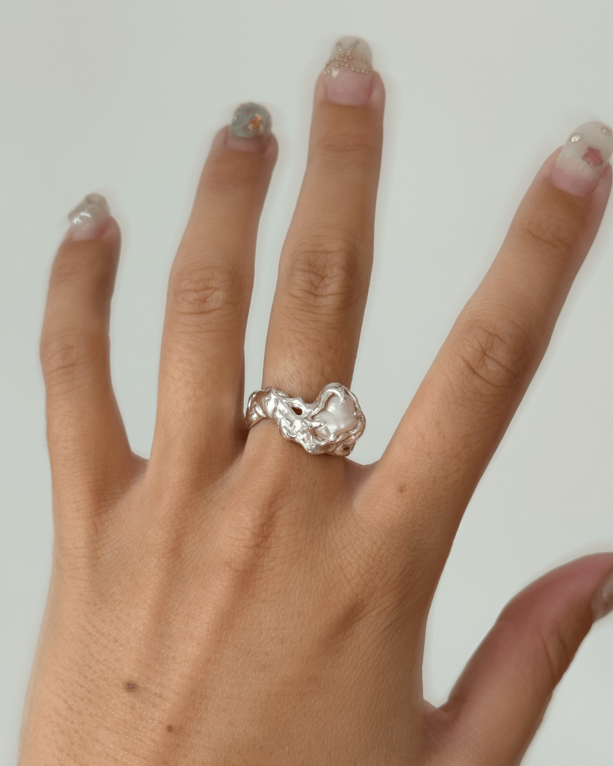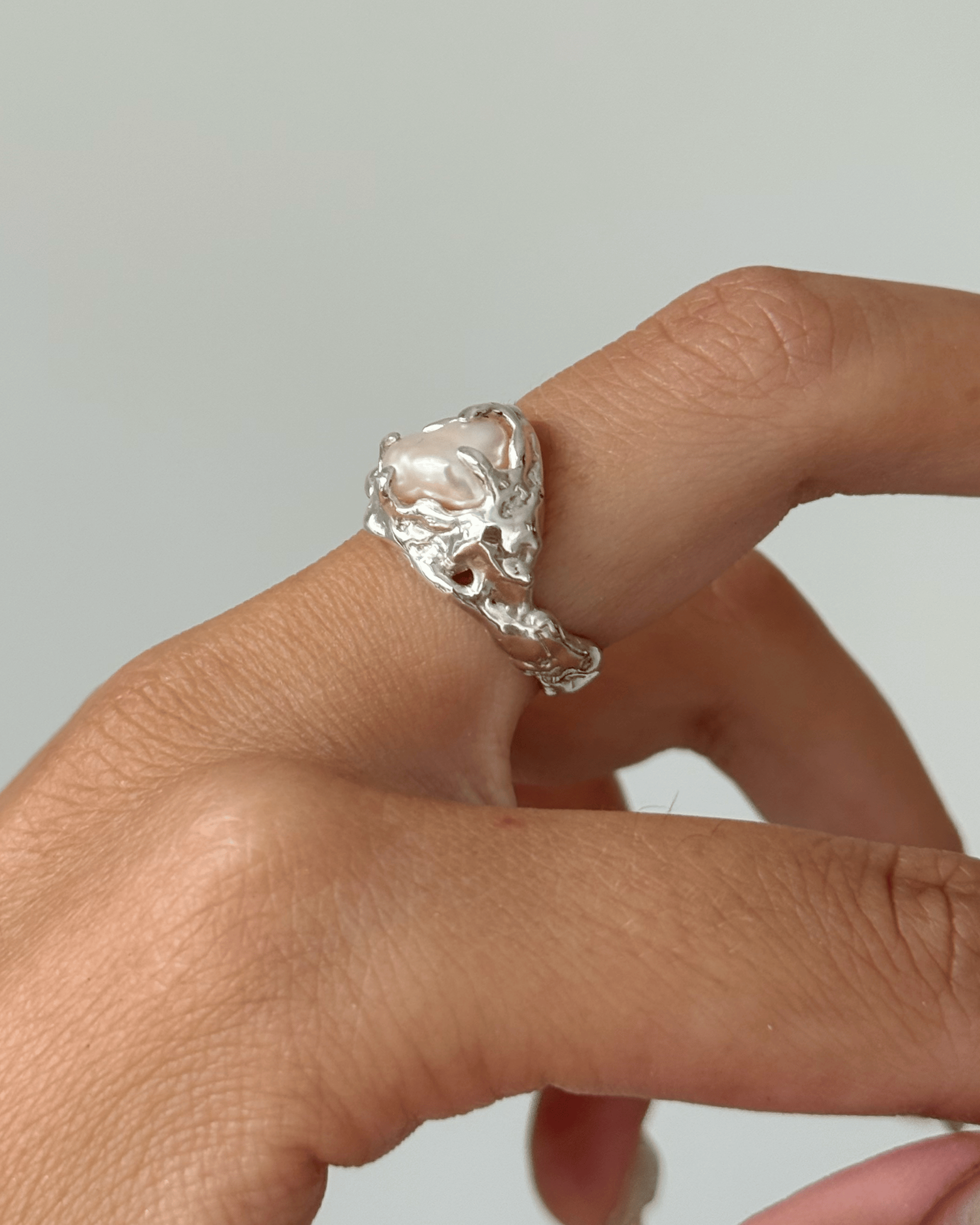 Ring 04 of the 'GROTESQUE' mini-drop—the ring features a beautifully bulbous baroque pearl within a textured band and claw setting. Designed to read like a metallic exoskeleton that has grown around the pearl, akin to a parasitic armature.