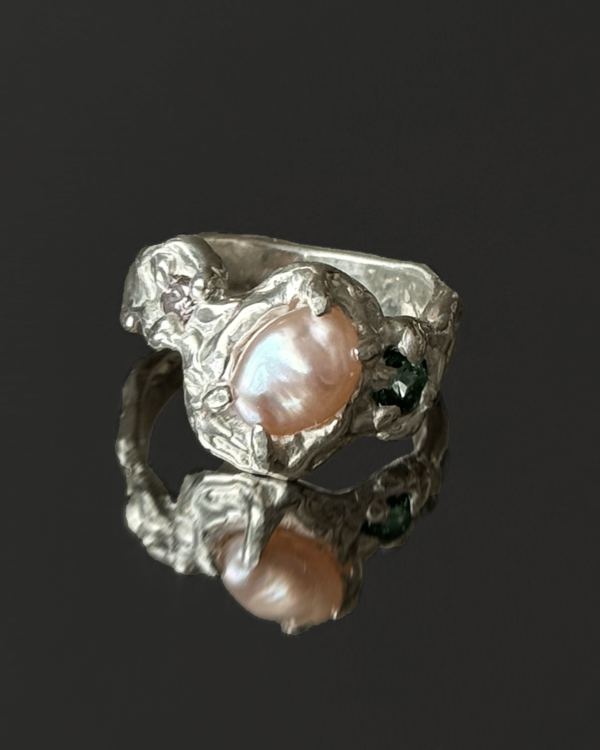 Ring 05 of the 'GROTESQUE' mini-drop—an undulating pink pearl is set between two complementary gemstones. Inspired by rococo art and architecture, the ring is excessive and ornate. Still a little gross though.