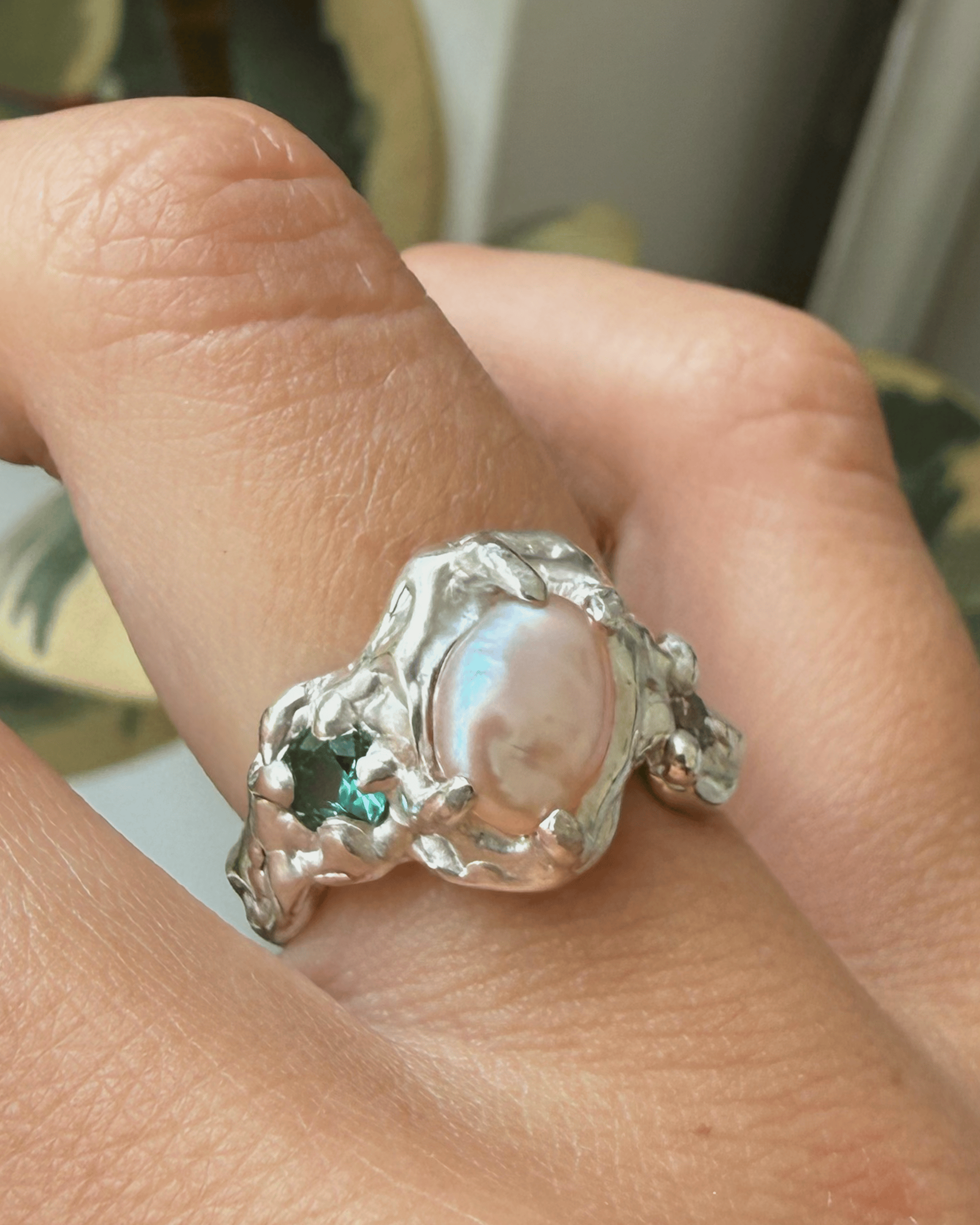 925 recycled sterling silver set with a freshwater baroque pearl, square and round lab gemstones